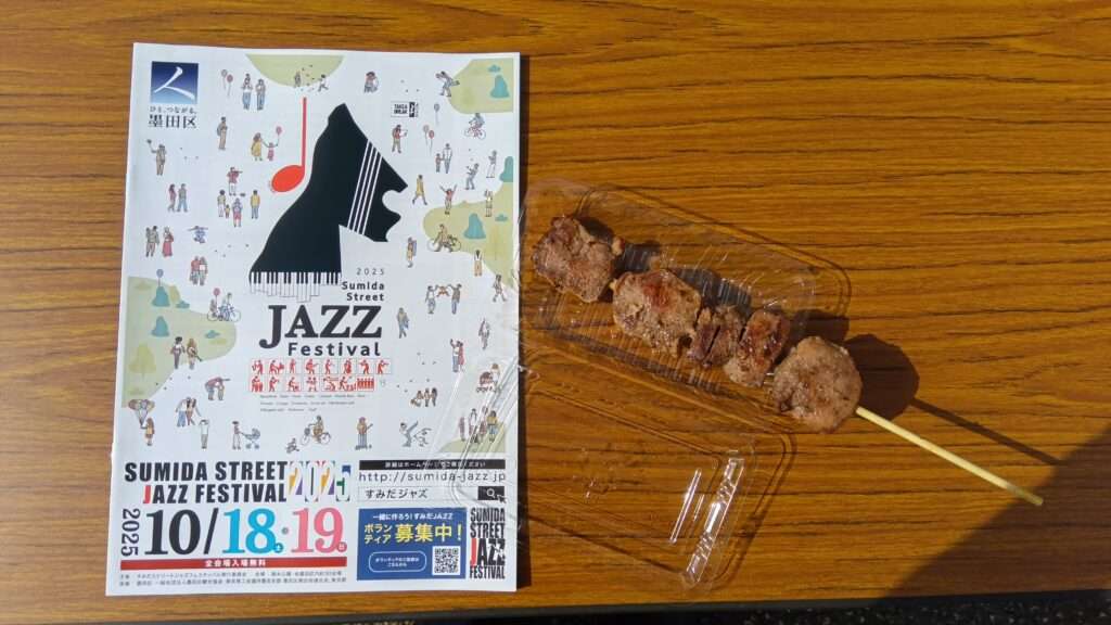 今日10月18日~19日で「すみだストリートジャズフェスティバル」が開催中です、今年でなんと15周年になるそうです。錦糸公園をはじめ区内で29のステージが同時開催。お昼前に錦糸公園の駄菓子の定番「うまい棒」でおなじみ「やおきんステージ」(やおきんは墨田区の会社)に訪問しました。立志社高校吹奏学部が演奏中でした。やはり生バンドは良いです。飲食の出店は相変わらずビールなどお酒が多い中、ジビエの店が何件も出店していました。中でも目を引いたのはアナグマハンバーグやアライグマハンバーグ、さすがに手を出す勇気がなかったので、普通にタン塩串を・・。この後も19時まで何組ものアーティストが出演です。