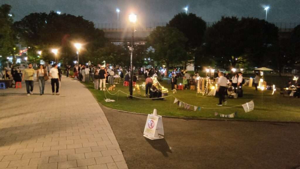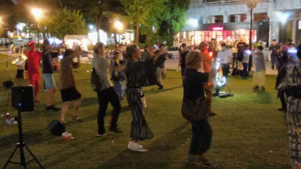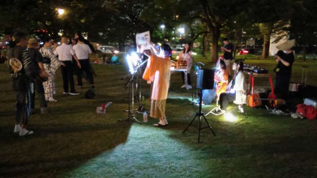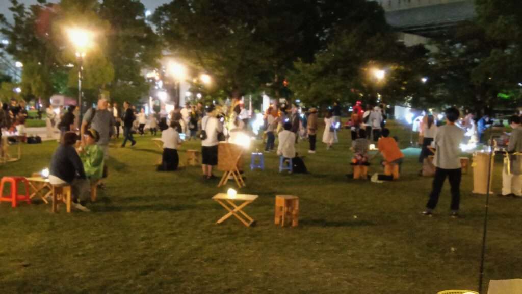 十五夜の昨日、隅田公園そよ風広場で月見夜会が開催されていました。残念ながら曇り空だったので探してもお月さまは見えませんでしたが涼しい中沢山の人が集まっていました。21時まで数組のアーティストの出演があるそうです。私が訪問時は18時過ぎでしたので民謡?でした。歌い手さんの声も澄んで良く通っていて、輪の外で見ている外国人観光客も自然と見様見真似で踊っているのを見て、歌と踊りは万国共通なのだなと感じました。クラフトビールや雑貨くじ、キッチンカー、なぜかタロット占いまで出ていました。