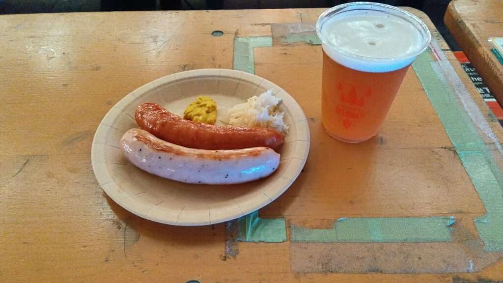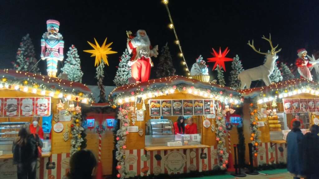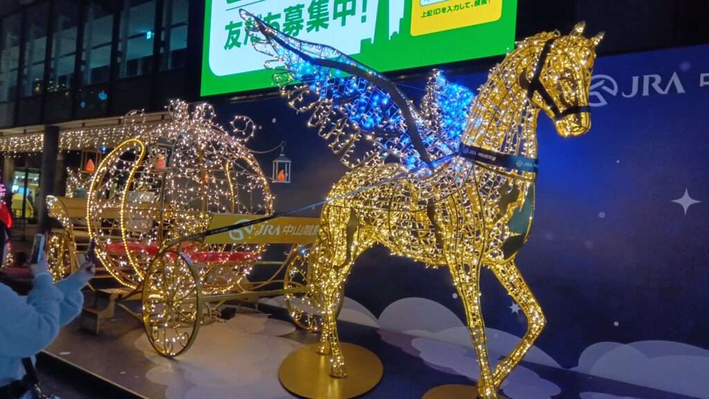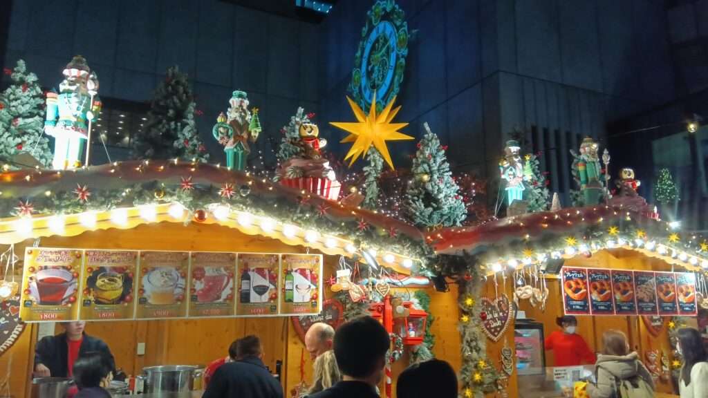 先日、昼間に行った4Fスカイアリーナをライトアップした状態で見たいと思い、夜の「絵本の中のクリスマスマーケット」に行って来ました。平日にもかかわらず沢山の人々が訪れて楽しそうに飲んで食べていました。本場ドイツから輸入されたというエルツ人形は昼間とは全然ちがう表情を見せていました。ペガサスの馬車がひときわキレイでした。ドイツと言うとやはりソーセージとホフブロイのビールを買ってしまいます・・。因みに今回はちゃんとザワークラウト付きでした(オクトーバーフェストの時はポテトフライでした)。