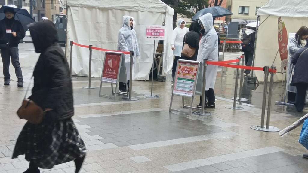 東京スカイツリーのソラマチ1F広場で栃木県産のいちご「とちあいか」の無料配布していましたので行って来ました。混雑してるだろうと予想していたのですが、雨と寒さのためか全く並ばずに試食出来ました。「とちあいか」は栃木県で10番目のオリジナル品種で2019年に初出荷された完全新種で、特徴は天候が悪くても育ちやすく病気も少ないのだそうです。いちごに詳しくはないですが食べた印象は香りが強く、とても甘いです。個人的には少し酸味がある方が好きなので、「とちおとめ」の方が好きかもしれないです。