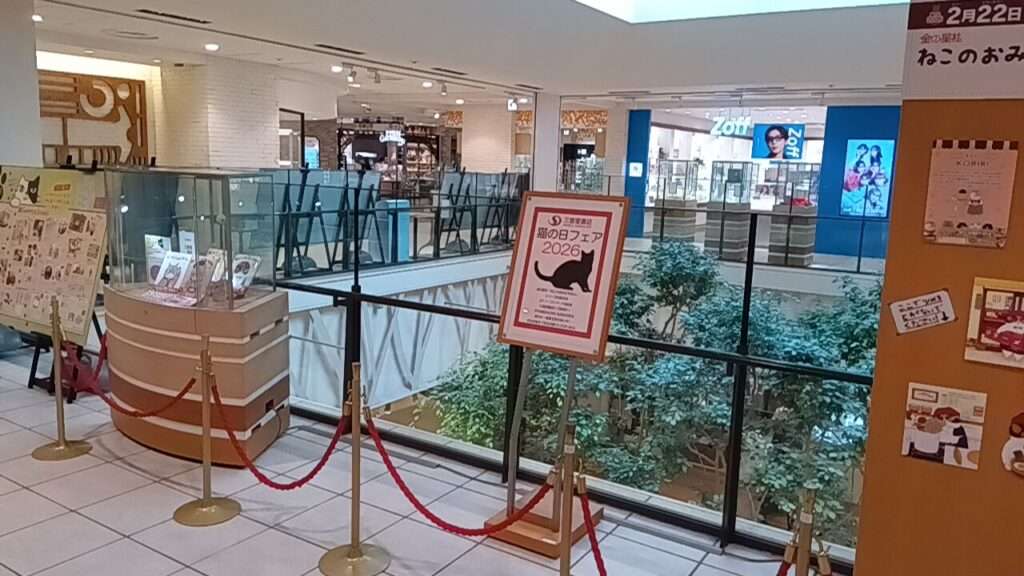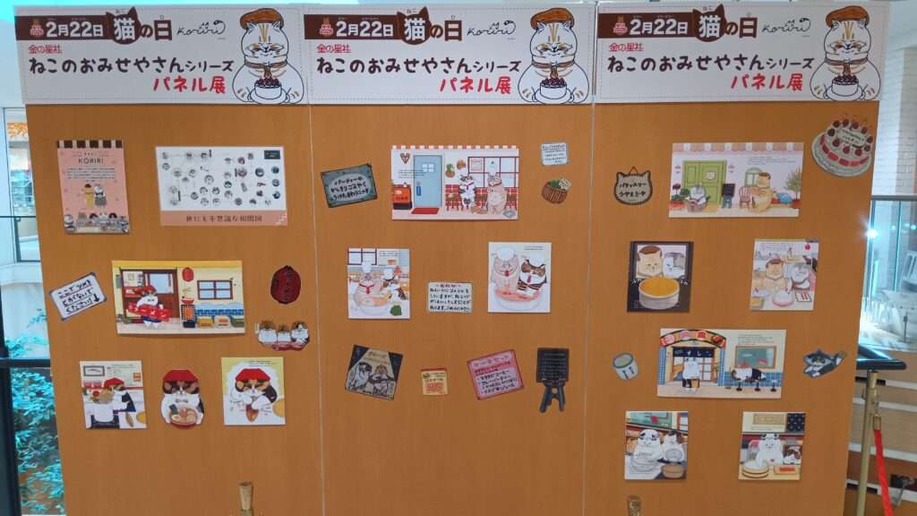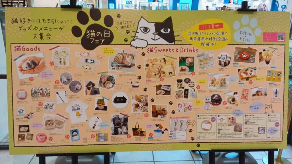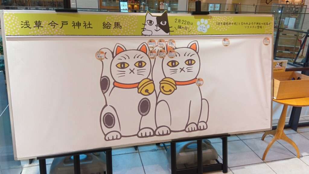 東京ソラマチで2月15日から猫の日フェア開催中です。2月22日(ニャンニャンヤン)に合わせて各店舗でネコグッズやスイーツなどを販売。特に3F吹き抜けエリアには招き猫発祥の地と云われる浅草の今戸神社の絵馬シールに願い事を書いて貼るスペースが設けられていて、あとでちゃんと奉納してくれるそうです。今週土~月にかけては5Fでリアルネコとのふれあいスペースも設けられます。今日は1Fペニーレインでネコが描かれた店舗限定フレンチトーストでお昼に。
