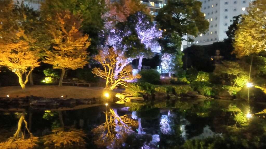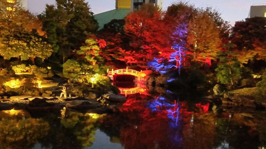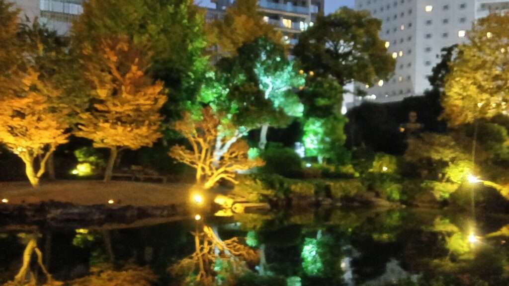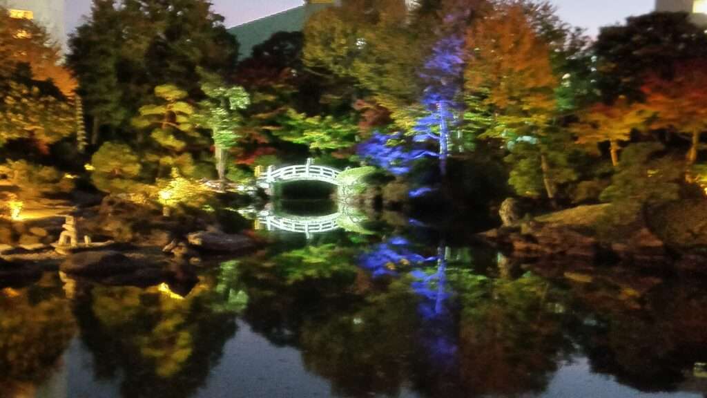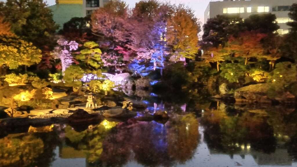 墨田区横網の旧安田庭園で「SUMIDA光のナイトガーデン」が開催中です。昔は隅田川の水を引いていましたが、現在はポンプで汐の満ち引きを再現している「心字池」を中心に心という字を描くように光を配置しゆっくりと変化するデジタル演出でライトアップしているそうですが、撮りたいと思う色でレンズを向けるとその瞬間に変わってしまうので切り替わりがもう少しゆっくりでもよいような気がします。でも秋の紅葉と相まって幻想的な風景であることは間違いないです。ナイトガーデンは12月28日まで毎日16時30分から20時まで開催です。